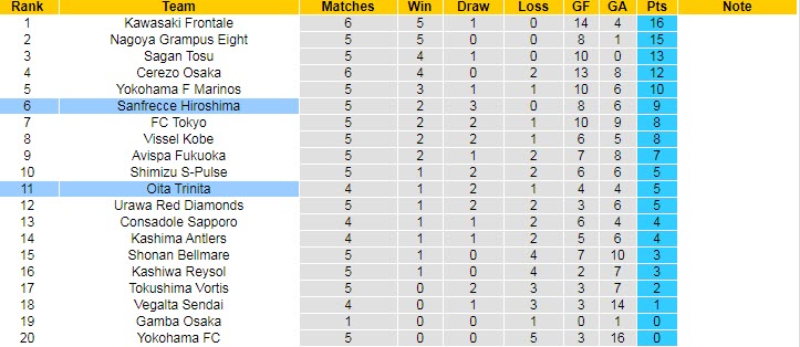 Chiều nay, họ có chuyến hành quân tới sân của đối thủ yếu hơn Oita Trinita và đây sẽ là bài test kiểm chứng quyết tâm của các cầu thủ Sanfrecce Hiroshima. Nếu xét về phong độ, Oita Trinita có phần thua kém đối thủ khi giành 1 trận thắng, hòa 2 và thua 1 lần sau 4 trận đã đá.