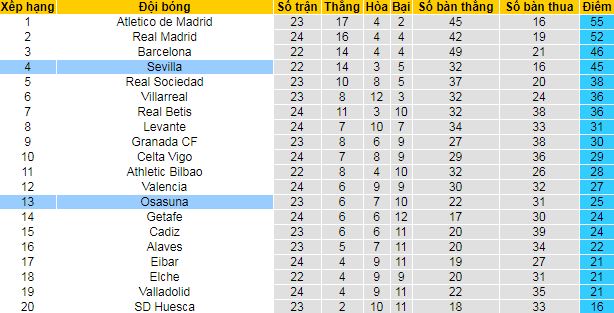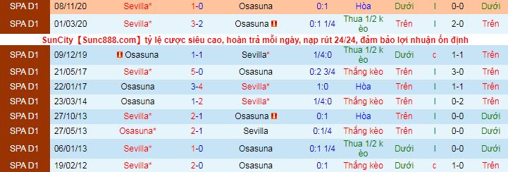 Trong 4 lần đối mặt với Sevilla gần nhất, Osasuna đã thua đến 3 trận. Trận đấu lượt đi hồi tháng 10, Sevilla cũng đã có được thắng lợi nhẹ nhàng 1-0 trên sân nhà. Do đó NHM nên đặt niềm tin vào các vị khách ở trận đấu tới đây.