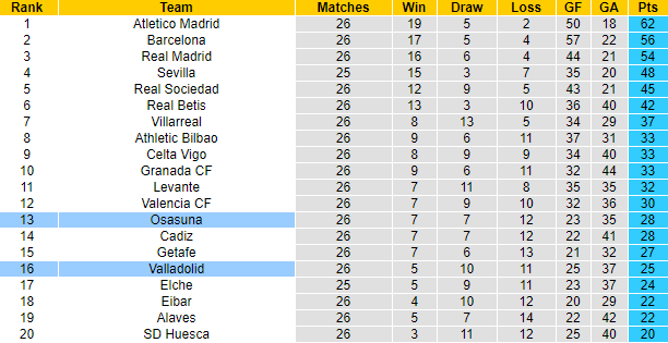 Khoảng cách trên bảng xếp hạng La Liga lúc này giữa Osasuna và Valladolid là 3 bậc và 3 điểm. Cụ thể, sau 26 vòng đấu, Osasuna giành 28 điểm, xếp thứ 13, trong khi với số trận tương tự Valladolid giành 25 điểm, xếp thứ 16. Thành tích tốt hơn lại được thi đấu trên sân nhà, Osasuna hoàn toàn xứng đáng được xếp chiếu trên khi đối đầu Valladolid.