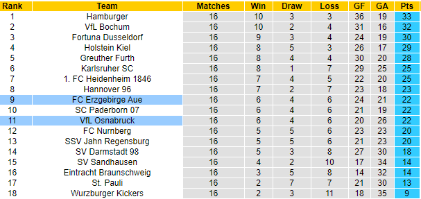Cả Osnabruck lẫn Erzgebirge Aue đều không được đánh giá cao ở giải hạng 2 Đức, và màn trình diễn của đôi bên từ đầu mùa cũng phản ánh đúng điều đó. Osnabruck đang đứng thứ 11 còn Erzgebirge Aue xếp thứ 9 với cùng điểm số 22. Đôi bên khó vươn lên nhóm cạnh tranh vé thăng hạng nhưng cũng đang có được sự an toàn.