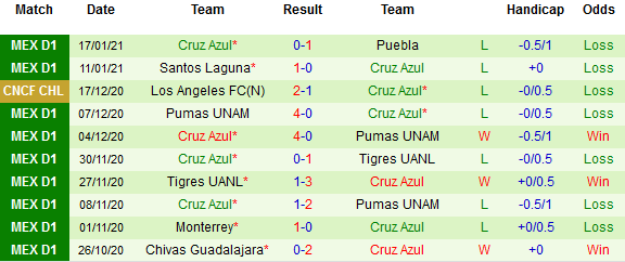 + Thống kê 10 trận gần nhất của Cruz Azul