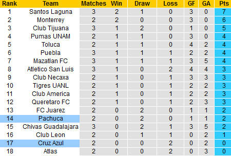 Cả Pachuca và Cruz Azul đều khởi đầu thất vọng khi chưa có chiến thắng nào sau 2 vòng. Tuy nhiên, Pachuca để lại dấu ấn hơn khi có 2 trận hòa và chỉ 1 lần bị chọc thủng lưới. Trong khi đó, Cruz Azul sa sút quá nhiều với 2 trận thua cùng với tỷ số 0-1.