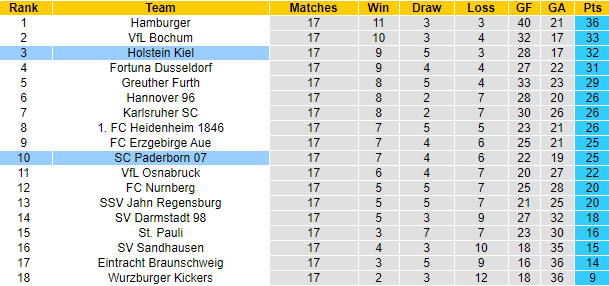 Paderborn đang xếp ở vị trí thứ 10 trên bảng xếp hạng Bundesliga 2 với 25 điểm sau 17 trận. Trong khi đó Holstein Kiel dadx giành được 32 điểm trước vòng 18, xếp ở vị trí thứ 3 và chỉ kém đội xếp trên đúng 1 điểm. Thành tích tốt hơn hẳn đối thủ nhưng trận đấu sắp tới, Holstein Kiel vẫn phải xếp chiếu dưới.