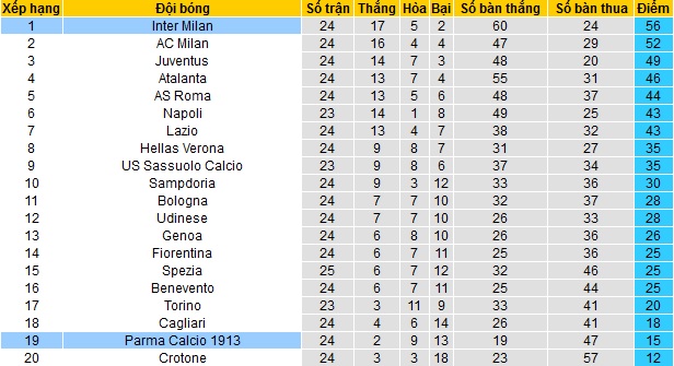 Trận đấu muộn nhất của vòng 25 giải vô địch quốc gia Italia sẽ là cuộc đọ sức giữa Parma và Inter Milan. Thế nhưng hai đội đang có vị thế trái ngược nhau vào thời điểm hiện tại. Parma hiện vẫn đang vật lộn ở vị trí áp chót bảng xếp hạng khi mới chỉ có được 15 điểm sau 24 vòng đấu. Hiện tại Parma đang hơn đội bét bảng Crotone 3 điểm nhưng đang còn kém nhóm các đội trụ hạng tới 5 điểm và còn thi đấu nhiều hơn 1 trận.