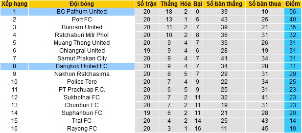 Trong khi đó Bangkok United đang đứng thứ 5 trên bảng xếp hạng với 31 điểm có được cũng sau 20 vòng đấu. Hiện Bangkok United đang có cùng điểm với cả 3 đội xếp ngay sau nhưng xếp trên nhờ hơn về hiệu số bàn thắng, tuy nhiên đội bóng cũng đang kém đội thứ nhì tới 9 điểm.