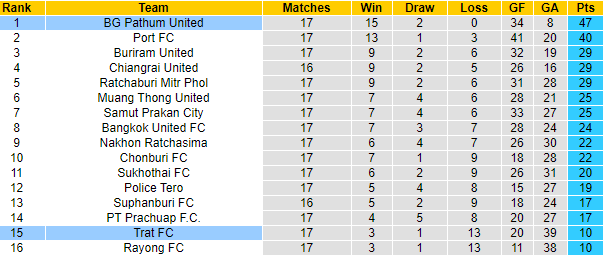 Trên BXH, Trat đứng tận thứ 15, trong vùng nguy hiểm với chỉ 10 điểm/17 trận. Khoảng cách giữa họ tới vị trí an toàn đã lên tới 7 điểm, con số không dễ san lấp. Nhìn chung thì giữa 2 đội đang có sự đối lập hoàn toàn về vị thế, Pathum United lại còn được chơi trên sân nhà trận này.