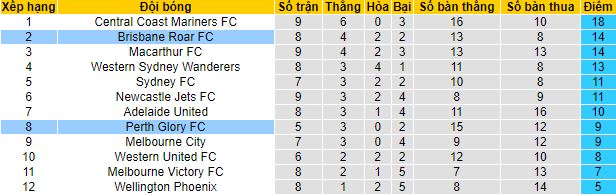 Perth Glory đang có sự trở lại đầy mạnh mẽ gần đây với 3 chiến thắng và 2 trận hoà ở 5 vòng đấu gần nhất. Dù mới có được 9 điểm sau 5 vòng đấu và kém đội dẫn đầu tới 9 điểm nhưng cần nhớ rằng Perth Glory còn thi đấu ít hơn các đội phía trên từ 3-4 trận. Do đó, cơ hội để họ vươn lên hay thậm chí chiếm ngôi đầu bảng là vô cùng sáng sủa.