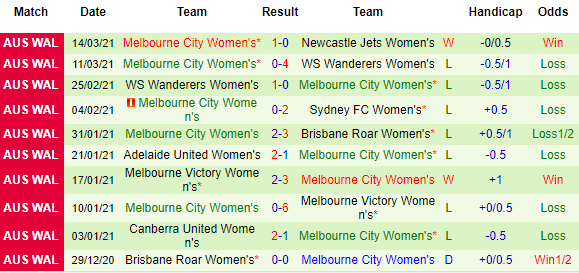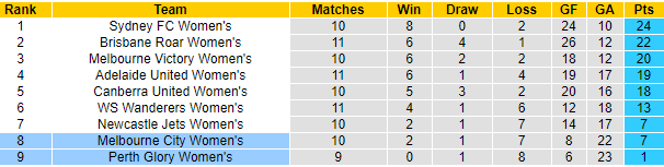 Phía đối diện, Melbourne City (W) cũng không phải là CLB được đánh giá cao. Thực tế thì Melbourne City (W) hiện tại chỉ xếp áp chót, ngay trên chính Perth Glory (W). Dù vậy thì về mặt điểm số, Melbourne City (W) hơn Perth Glory (W) tới 6 điểm.