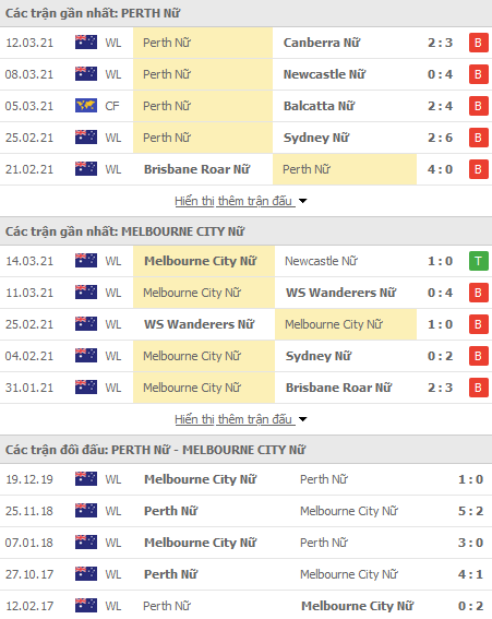 Phong độ và thống kê đối đầu gần đây Perth Glory (W) vs Melbourne Victory (W):