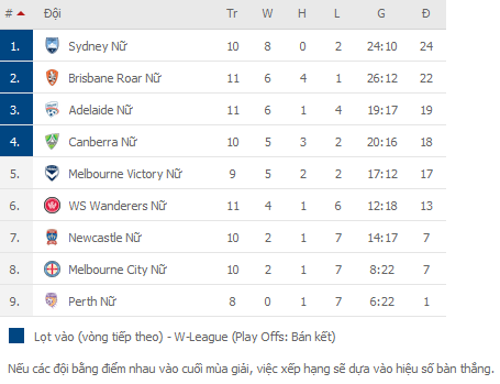BẢNG XẾP HẠNG Vô địch Nữ Australia
