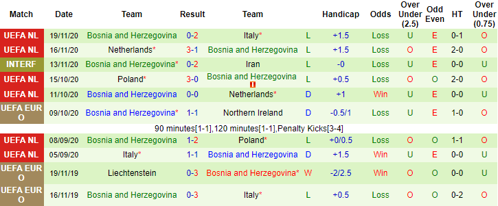 + Thống kê 10 trận gần nhất của Bosnia-Herzegovina