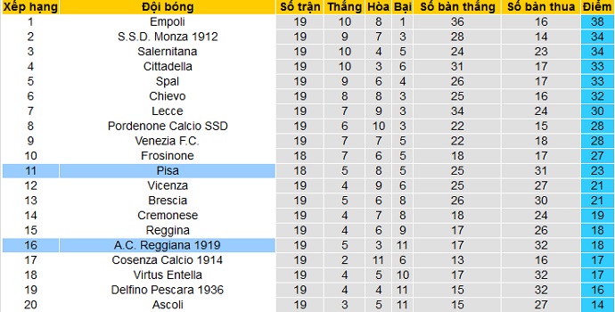 Bảng xếp hạng giải hạng nhì Italia trước vòng 20