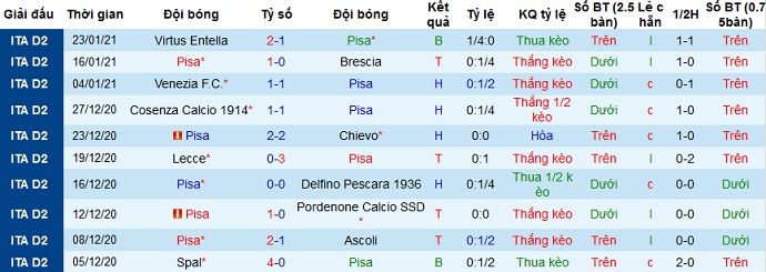 Phong độ gần đây của Pisa cũng không thật tốt khi ở 5 trận gần nhất đội bóng chỉ có được 1 trận thắng, 3 trận hòa và để thua 1 trận. Thế nhưng trên sân nhà thành tích của đội bóng vẫn khá tốt khi bất bại 5 trận gần nhất tại đây với 3 trận thắng và 2 trận hòa.