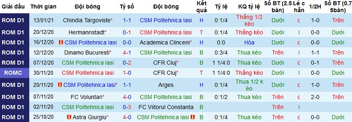 + Thống kê 10 trận gần nhất của Politehnica Iasi