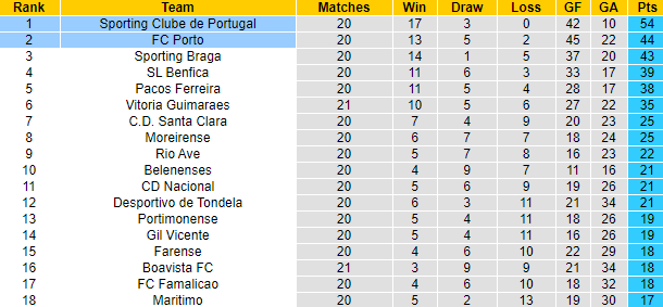 Bảng xếp hạng giải VĐQG Bồ Đào Nha