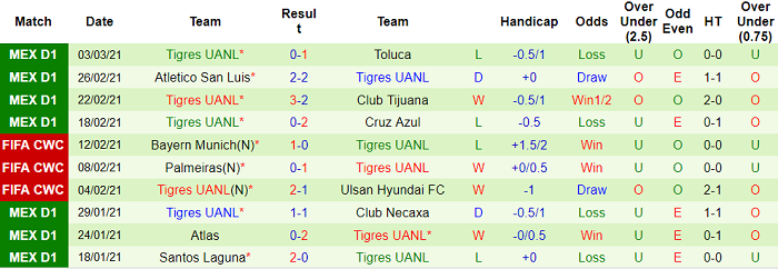 - Thống kê 10 trận gần nhất của Tigres UANL