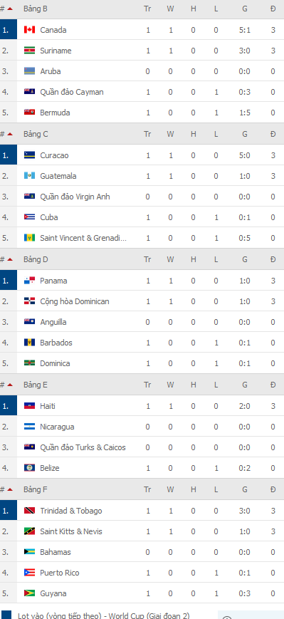 BẢNG XẾP HẠNG Vòng loại World Cup 2022 CONCACAF