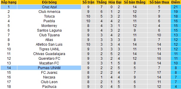 Trái lại Cruz Azul vẫn đang dẫn đầu bảng xếp hạng sau 9 vòng đầu tiên. Với 21 điểm có được, Cruz Azul đang hơn đội nhì bảng Club America 2 điểm, đồng thời hơn đội thứ ba Toluca 3 điểm nhưng đang thi đấu ít hơn 1 trận.