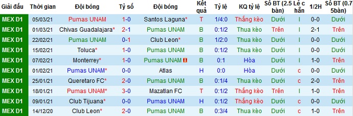+ Thống kê 10 trận gần nhất của Pumas UNAM