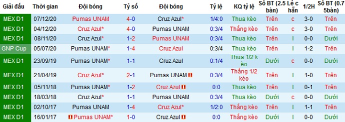 Ngay cả trong lịch sử ở 6 lần đối đầu gần nhất khi Pumas UNAM được thi đấu trên sân nhà, họ cũng chỉ giành được chiến thắng ở 2 trận, hòa 1 và để thua 3. Thế nên với phong độ đang rất ổn định của đội đầu bảng Cruz Azul, chọn cửa trên ở trận đấu này có lẽ vẫn là hợp lý.