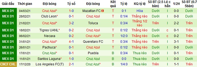 + Thống kê 10 trận gần nhất của Cruz Azul