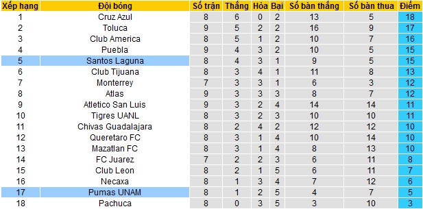 Trong khi đó Santos Laguna lại đang chơi khá tốt ở giai đoạn lượt về khi đang đứng thứ 6 trên bảng xếp hạng với 15 điểm cũng sau 8 vòng đấu. Hiện tại Santos Laguna đang nằm trong nhóm các đội có suất dự play-off và cũng đang bằng điểm với đội đứng thứ tư Monterrey nhưng kém về hiệu số bàn thắng.