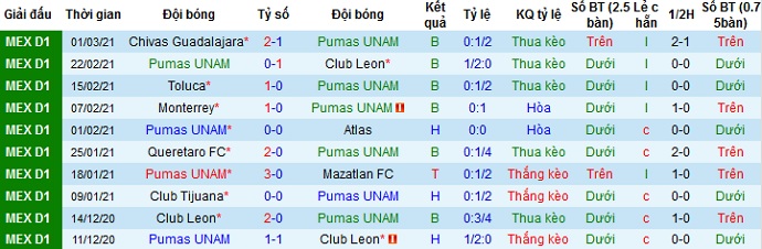 + Thống kê 10 trận gần nhất của Pumas UNAM