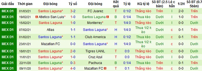+ Thống kê 10 trận gần nhất của Santos Laguna