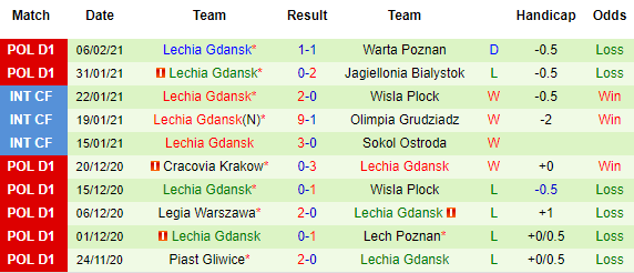 + Thống kê 10 trận gần nhất của Lechia Gdansk