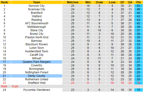 Thực tế thì từ đầu mùa, thành tích mà QPR giành được còn khá hơn so với của Derby County. Từng là cái tên sáng giá cho suất lên hạng nhưng Derby County lại thi đấu không tốt và đang ngấp nghé khu vực cầm đèn đỏ. Lúc này, Derby County chỉ còn hơn vị trí nguy hiểm phía sau có 2 điểm.