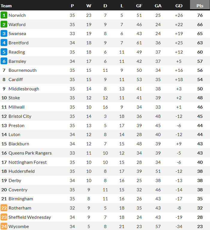 Sau 34 trận đầu tiên của Championship, Wycombe chỉ thu về 23 điểm: thắng 5, hòa 8 nhưng thua tới 21 trận. Họ xếp cuối bảng và kém vị trí an toàn do Birmingham nắm giữ tới 12 điểm.
