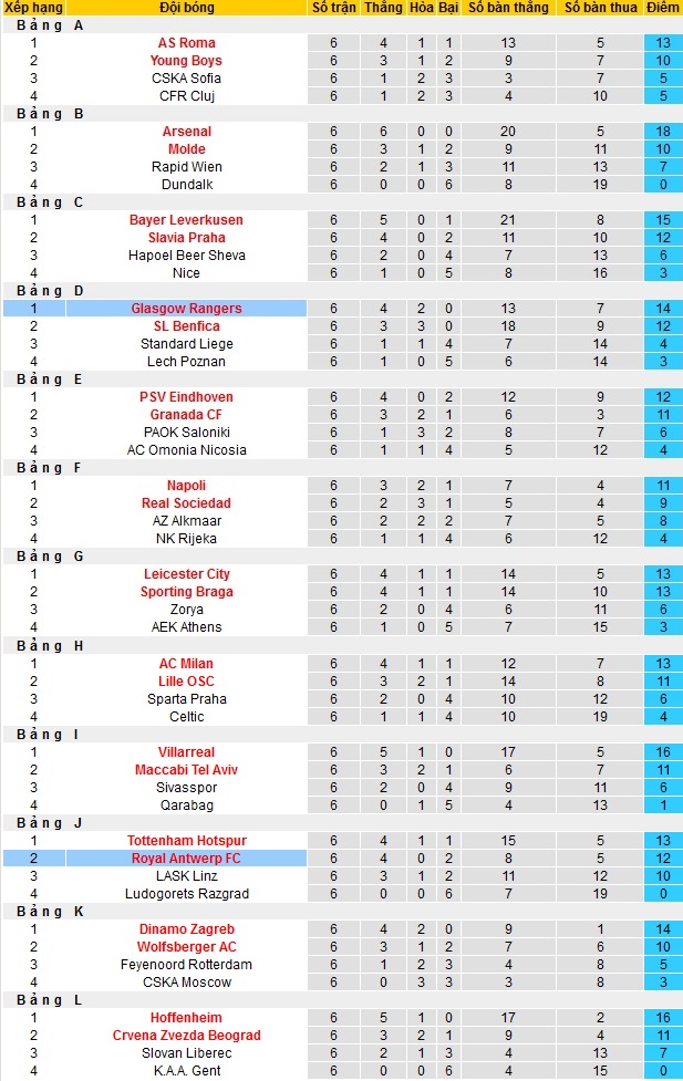 Bảng xếp hạng Europa League giai đoạn vòng bảng