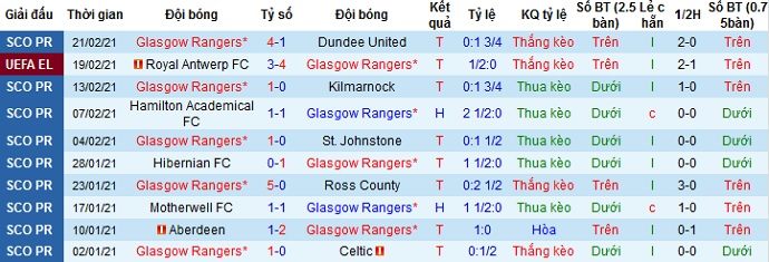 Hiện tại chuỗi trận bất bại của Rangers đã kéo dài lên con số 13, trong đó có tới 11 trận thắng và chỉ có 2 trận hòa. Trên sân nhà thành tích của đội bóng còn ấn tượng hơn khi bất bại tất cả 21 trận kể từ đầu mùa giải, trong đó chỉ để hòa 1 lần duy nhất và đang toàn thắng ở cả 8 trận gần đây.