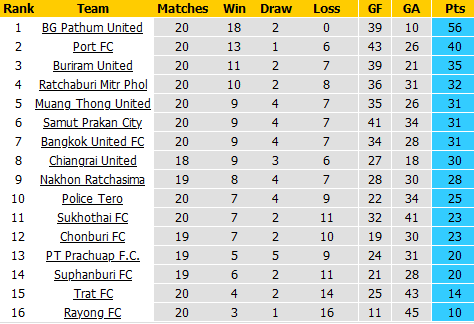 BẢNG XẾP HẠNG VĐQG Thái Lan
