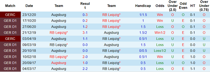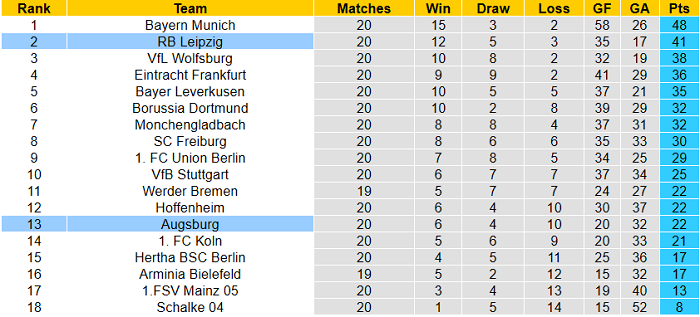 Khả năng ghi bàn của Augsburg ở trận này không cao do Leipzig không phải nhận bàn thua trong 7/10 trận gần nhất thuộc khuôn khổ Bundesliga. 6 trận sân nhà vừa qua tại Bundesliga, RB Leipzig không ghi quá 2 bàn/trận.