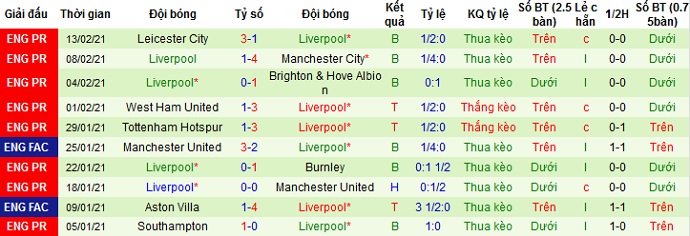 + Thống kê 10 trận gần nhất của Liverpool