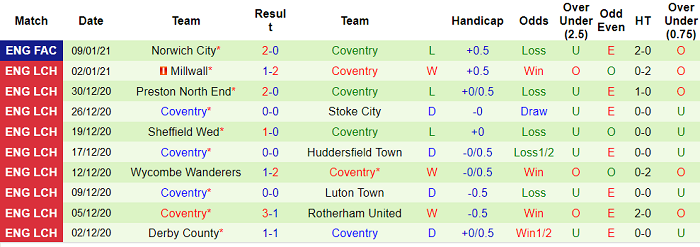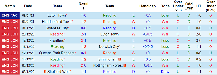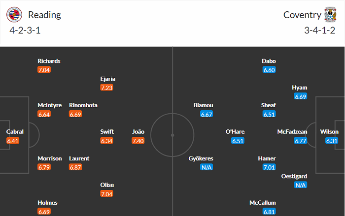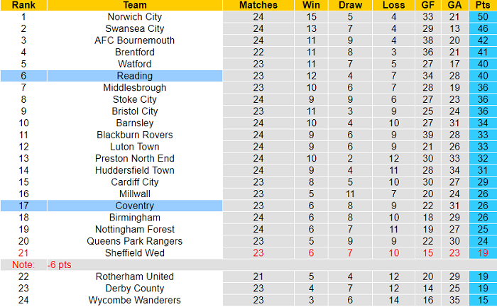 Reading sở hữu thành tích tương đối ấn tượng tại Championship 2020/21. Họ thu về 40 điểm sau 24 vòng đấu: thắng 12, hòa 4 và thua 7. Thành tích này dĩ nhiên tốt hơn đáng kể so với Coventry: 26 điểm trong cùng khoảng thời gian (thắng 6, hòa 8, thua 9).