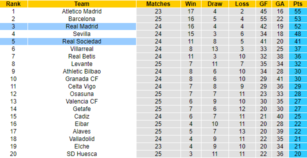 Real Madrid có nhiều hơn Sociedad 11 điểm sau 24 vòng đấu tại giải VĐQG Tây Ban Nha mùa này. Theo đó, Real Madrid đang có 52 điểm, xếp thứ 3 trên bảng xếp hạng. Kém đội xếp thứ 2 Barcelona 2 điểm nhưng đá ít hơn 1 trận, Real Madrid có động lực lớn để hướng về chiến thắng ở trận đấu sắp tới trên sân nhà.