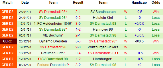 Tất nhiên thành tích nói trên cho thấy phong độ của Darmstadt không có gì đáng khen. Trong 5 vòng gần nhất, đội khách đã thua tới 4 trận là minh chứng rõ ràng nhất. Ở những chuyến hành quân xa, Darmstadt cũng thể hiện hình ảnh thất vọng khi ra về tay trắng tới 4 trong 5 trận gần đây tại Bundesliga 2.