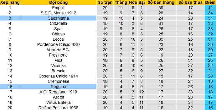 Trong khi đó Salernitana đang nằm trong nhóm có suất dự play-off giành suất lên hạng ở vị trí thứ 6 với 34 điểm sau 19 vòng đấu. Hiện Salernitana đang hơn các đội nằm ngoài Top 8 tới 5 điểm nhưng lại chỉ kém đội nhì bảng Monza đúng 1 điểm.