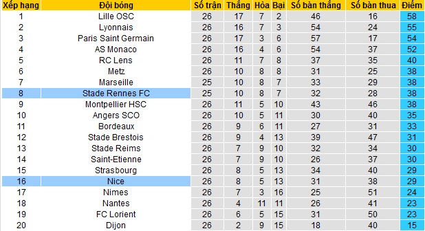 Trong khi đó Nice chỉ đang đứng thứ 16 trên bảng xếp hạng với 29 điểm sau 26 vòng đấu. Hiện tại đội bóng vẫn đang hơn nhóm các đội cầm đèn đỏ tới 6 điểm nhưng chỉ còn cách suất đi đấu play-off trụ hạng có đúng 2 bậc.