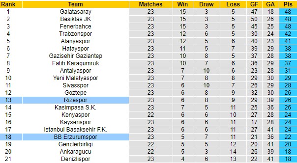Phía chủ nhà Rizespor, số điểm 26 mà họ đang có cũng chưa thực sự an toàn. Rizespor hơn chính Erzurum BB 4 điểm, và nếu thua đối thủ ở trận này thì họ hoàn toàn có thể rơi xuống vùng cầm đèn đỏ ở những lượt trận tiếp theo.