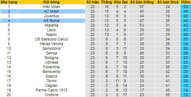 Bảng xếp hạng bóng đá Serie A