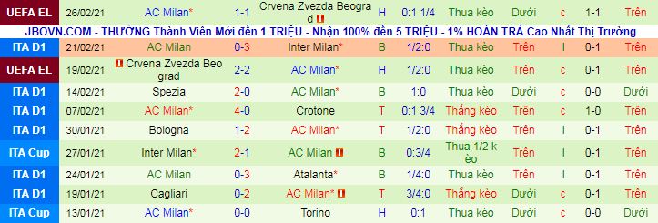 + Thống kê 10 trận gần nhất của AC Milan