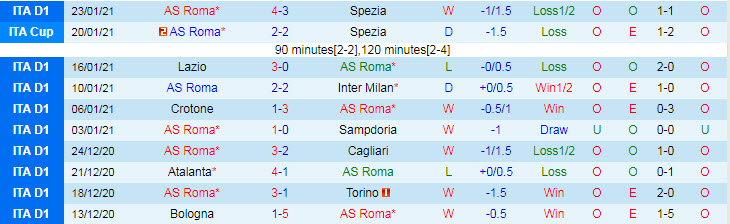 Lùi lại 3 vòng đấu mới đây, Roma chỉ có được đúng 1 trận thắng nhọc nhằn 4-3 trước tân binh Spezia, còn lại là 1 trận hòa và 1 thất bại. Xen kẽ, “Bầy sói” có thêm 1 trận thua trước Spezia tại cúp QG Italia.