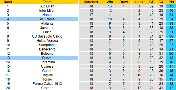 Roma là ông lớn của bóng đá Ý, trong khi đó mùa giải năm nay mới là lần đầu tiên Spezia thăng hạng lên Serie A. Trên bảng xếp hạng giải VĐQG Italia 2020/21, Roma đang xếp thứ 4 với 34 điểm sau 18 trận, Spezia mới có được 18 điểm, xếp ở vị trí thứ 13.