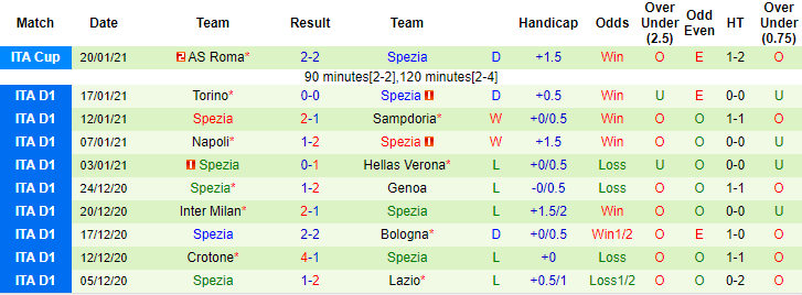 + Thống kê 10 trận gần nhất của Spezia