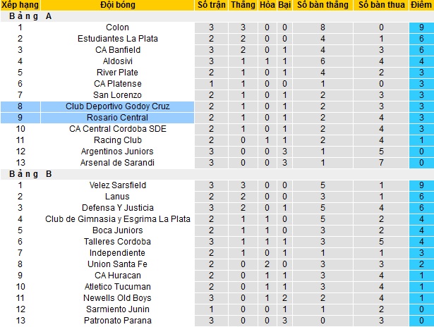 Bảng xếp hạng giải VĐQG Argentina vòng 3