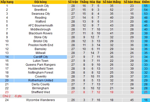 Trong khi đó Cardiff City đang đứng thứ 14 trên bảng xếp hạng với 34 điểm sau 27 vòng đấu. Mặc dù vậy khoảng cách với nhóm các đội cầm đèn đỏ cũng khá an toàn khi Cardiff City đang hơn 8 điểm. Thế nhưng đội bóng cũng đang kém nhóm các đội có suất dự play-off tới 11 điểm.
