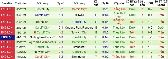 + Thống kê 10 trận gần nhất của Cardiff City